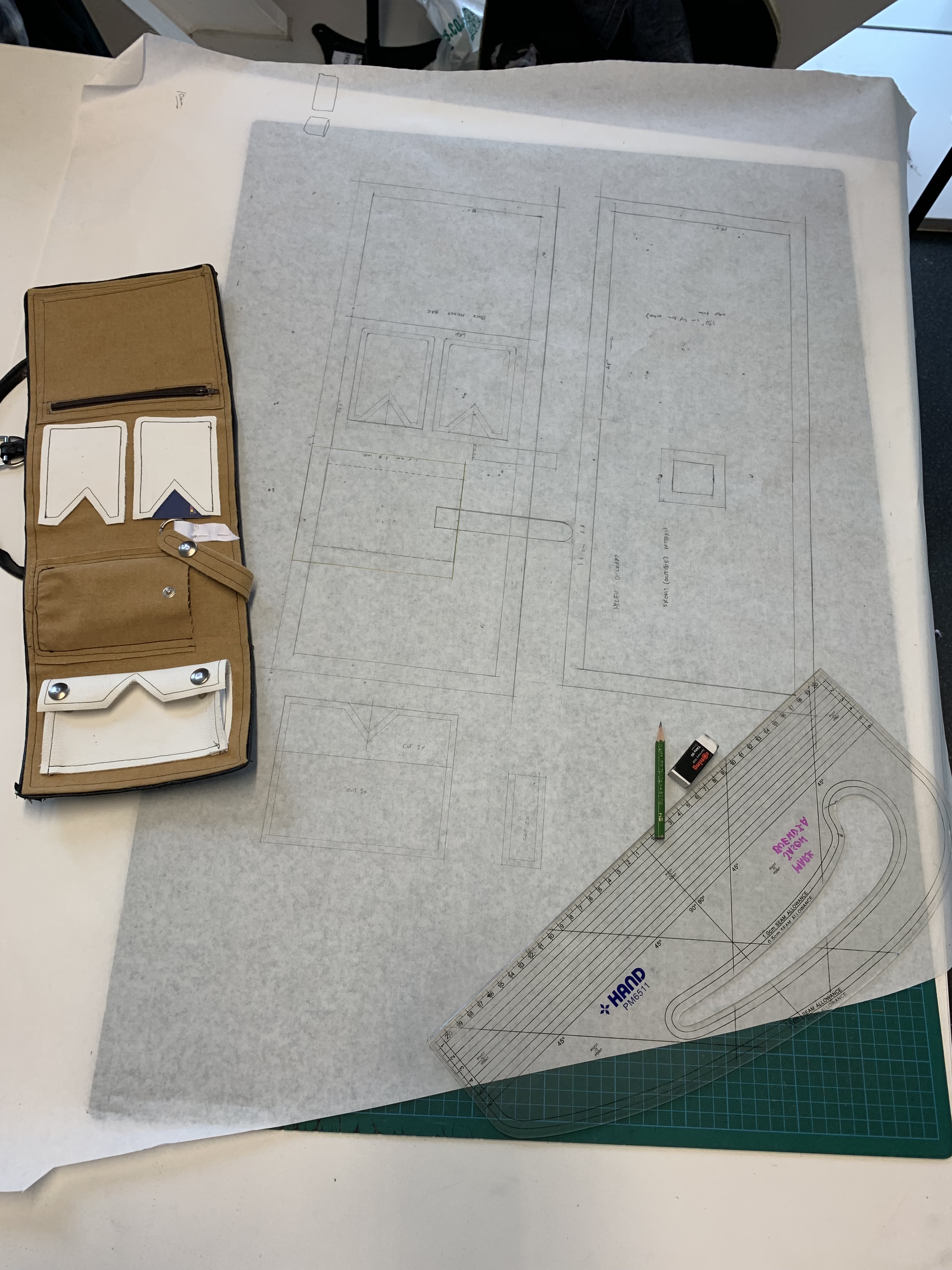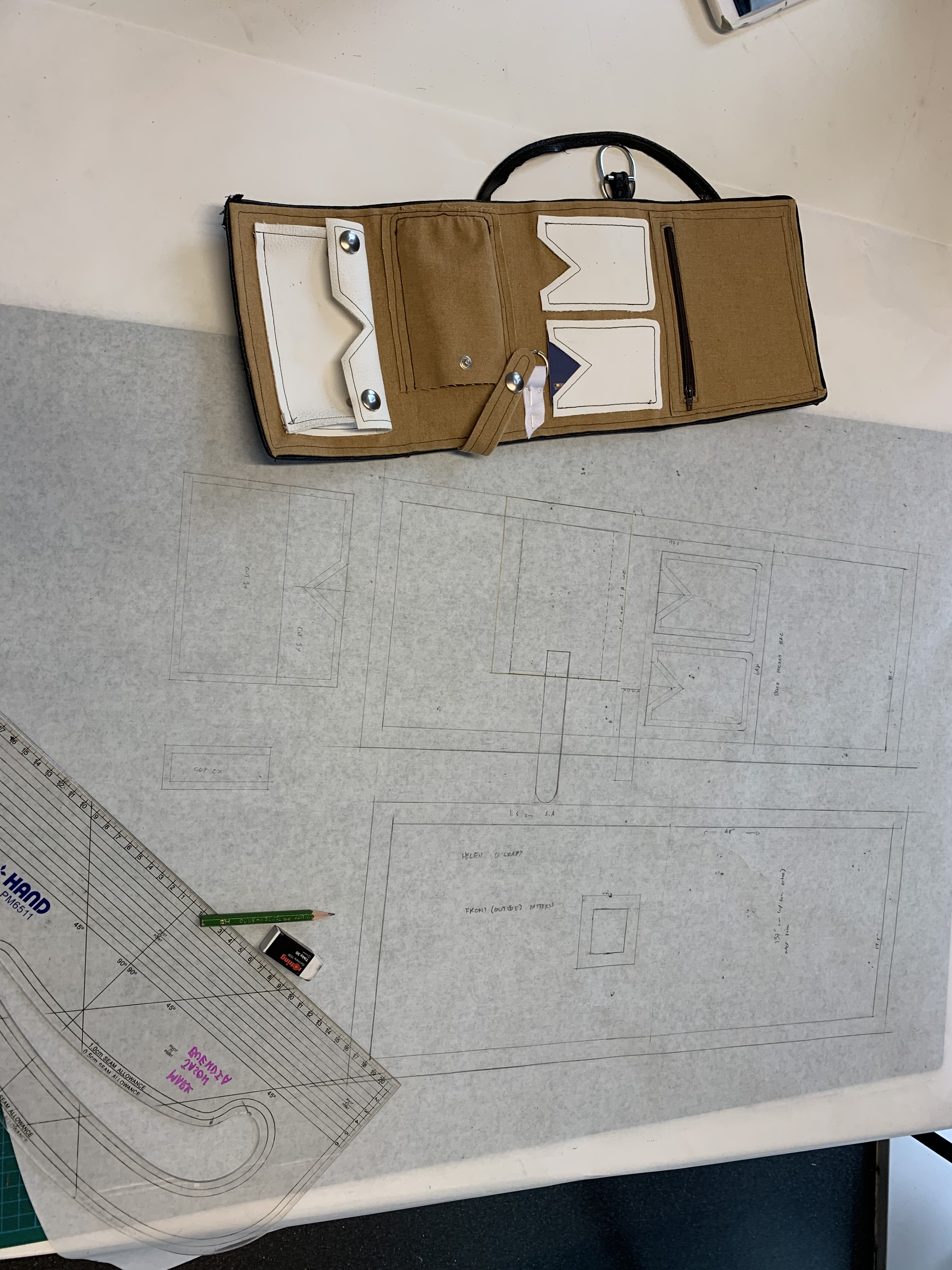 I drafted a pattern for an accessory. She made a purse for her wicker wings collection that she wanted to do for her final collection. However, she didn’t have pattern for it. I managed to copy her sample and translate it into a pattern. I then cut the pattern on a sample fabric and created a grid for her to mark her weave onto.