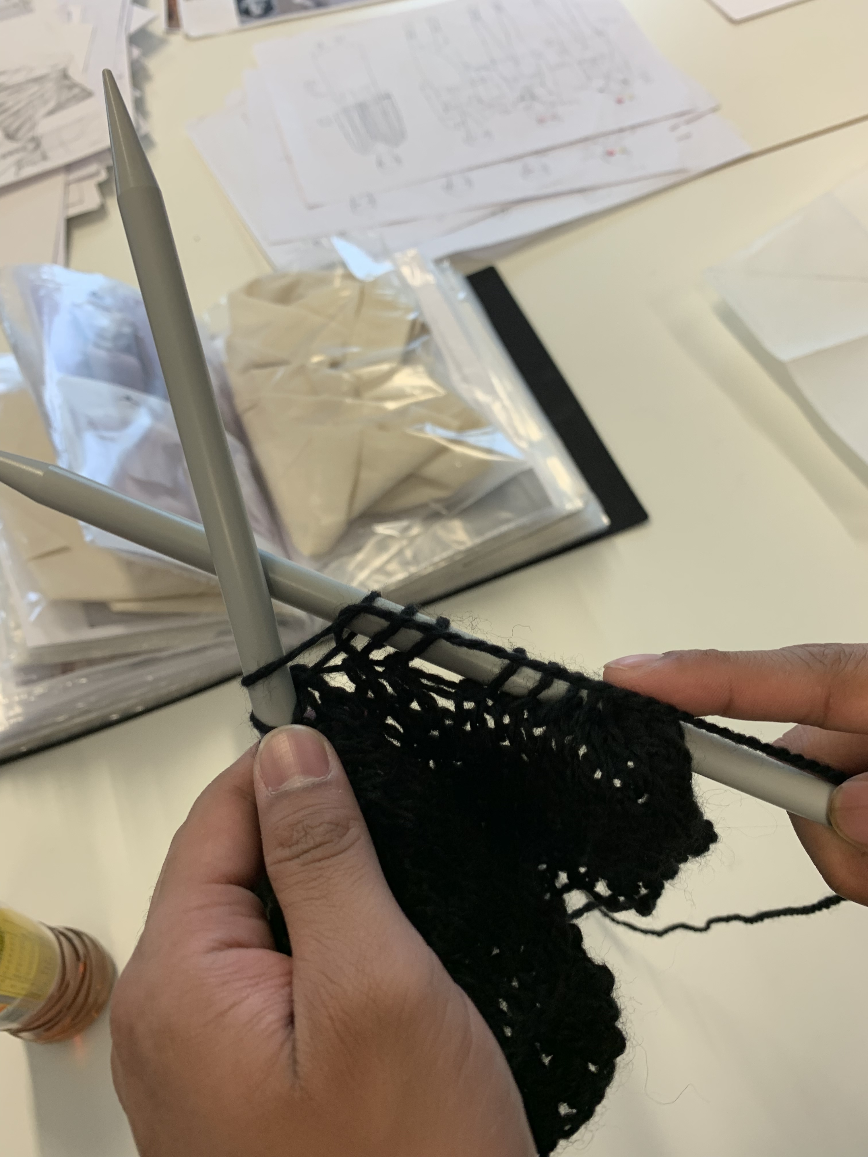 I continued practicing with knitting. Although, she decided making a knitted snood would be too heavy for the look, it was good the fact that I got to knit again and practice as I can easily apply this technique to my designs in the future. I also helped her in making a pattern for her weaving at the back of one of her design. However, the pattern wasn’t right, so she didn’t used it. Why was it not right?