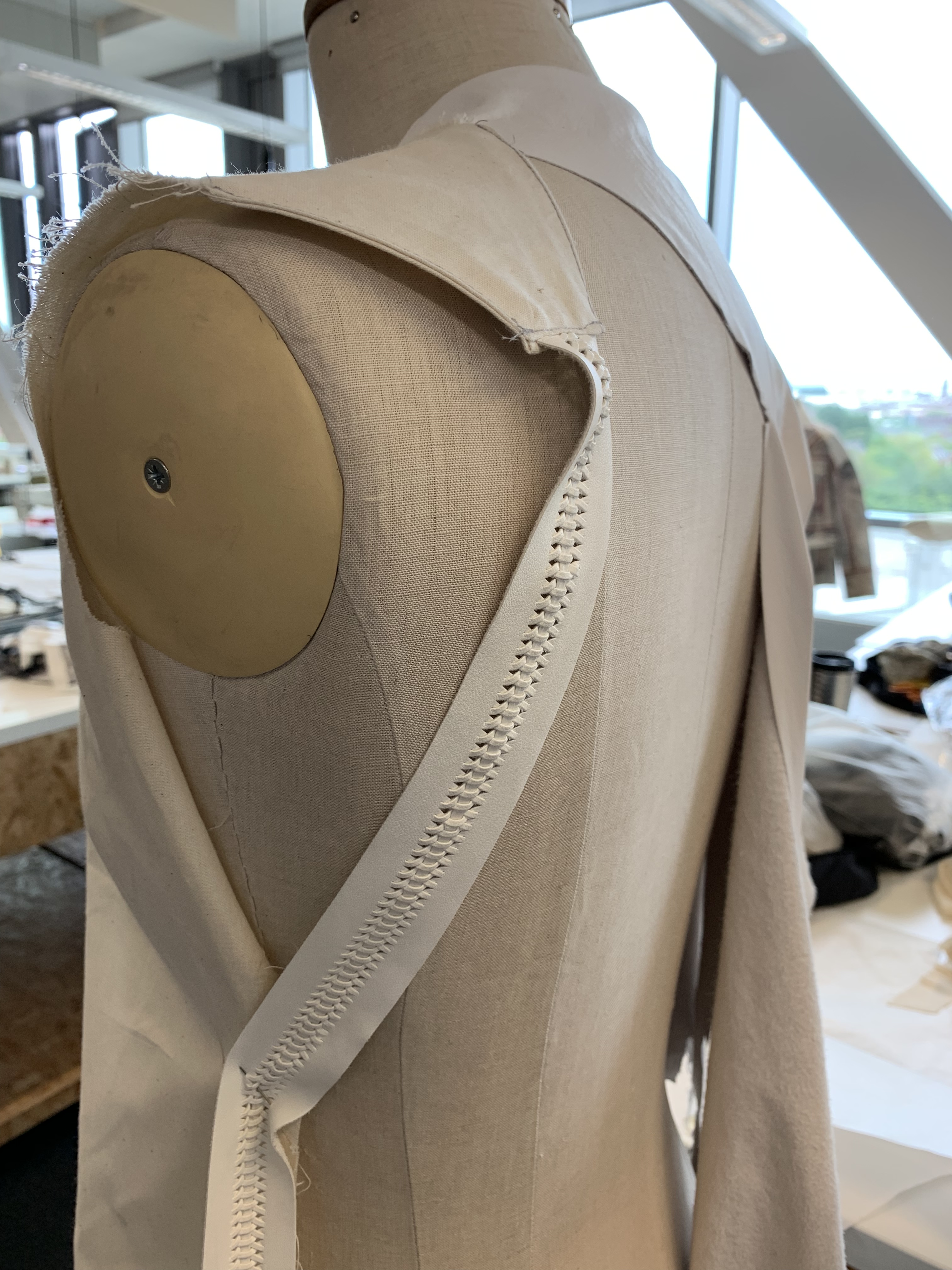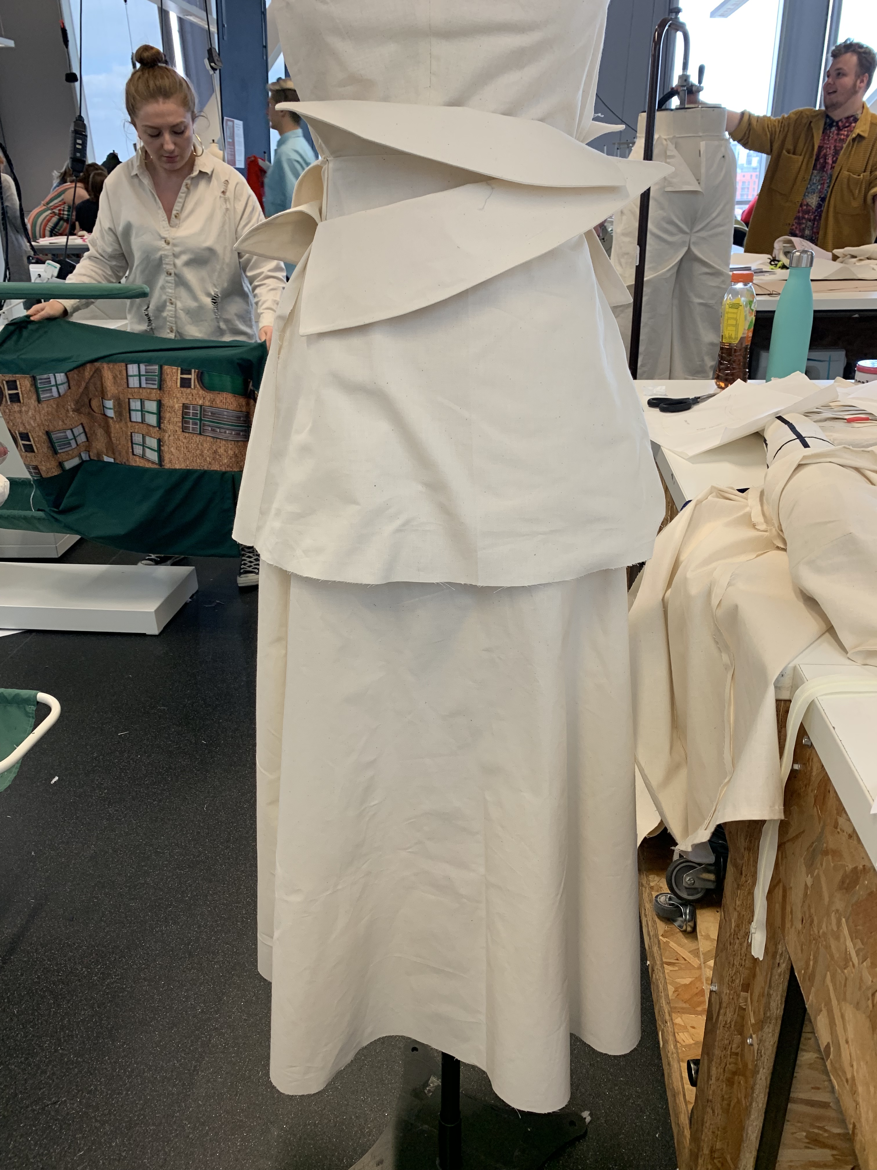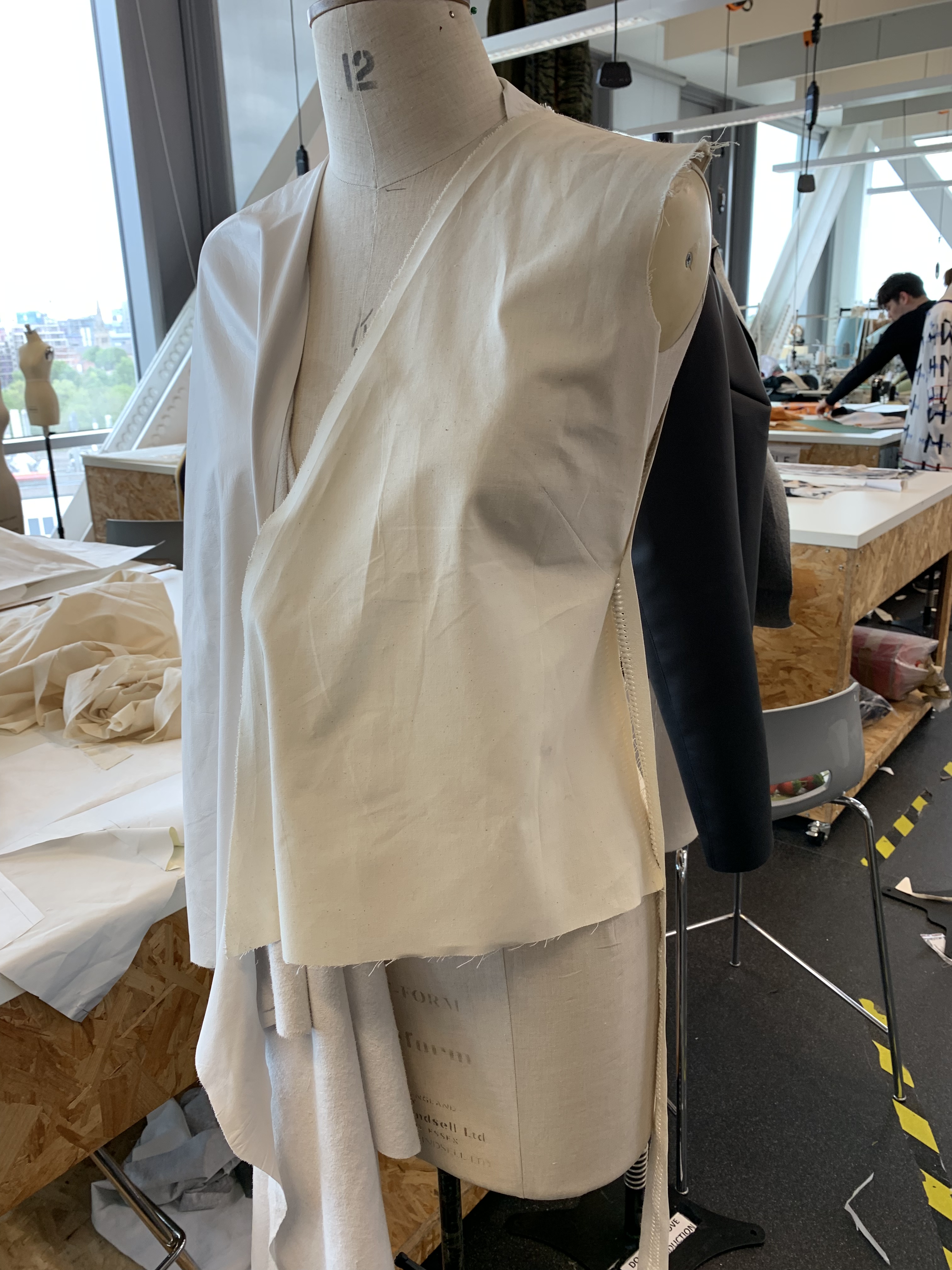 Getting close to the third years final critic, Helen noticed that she needs to create another top to go with her suit jacket as the original top that was going to be with the jacket didn’t look right when they were put together, so Helen decided to create another top. For today’s task I helped Helen in making a pattern and toiling for a new top. We also started draping on the mannequin and thinking of a silhouette and nice details to go with her collection. I came up with a design feature for the back of the top which Helen really liked.