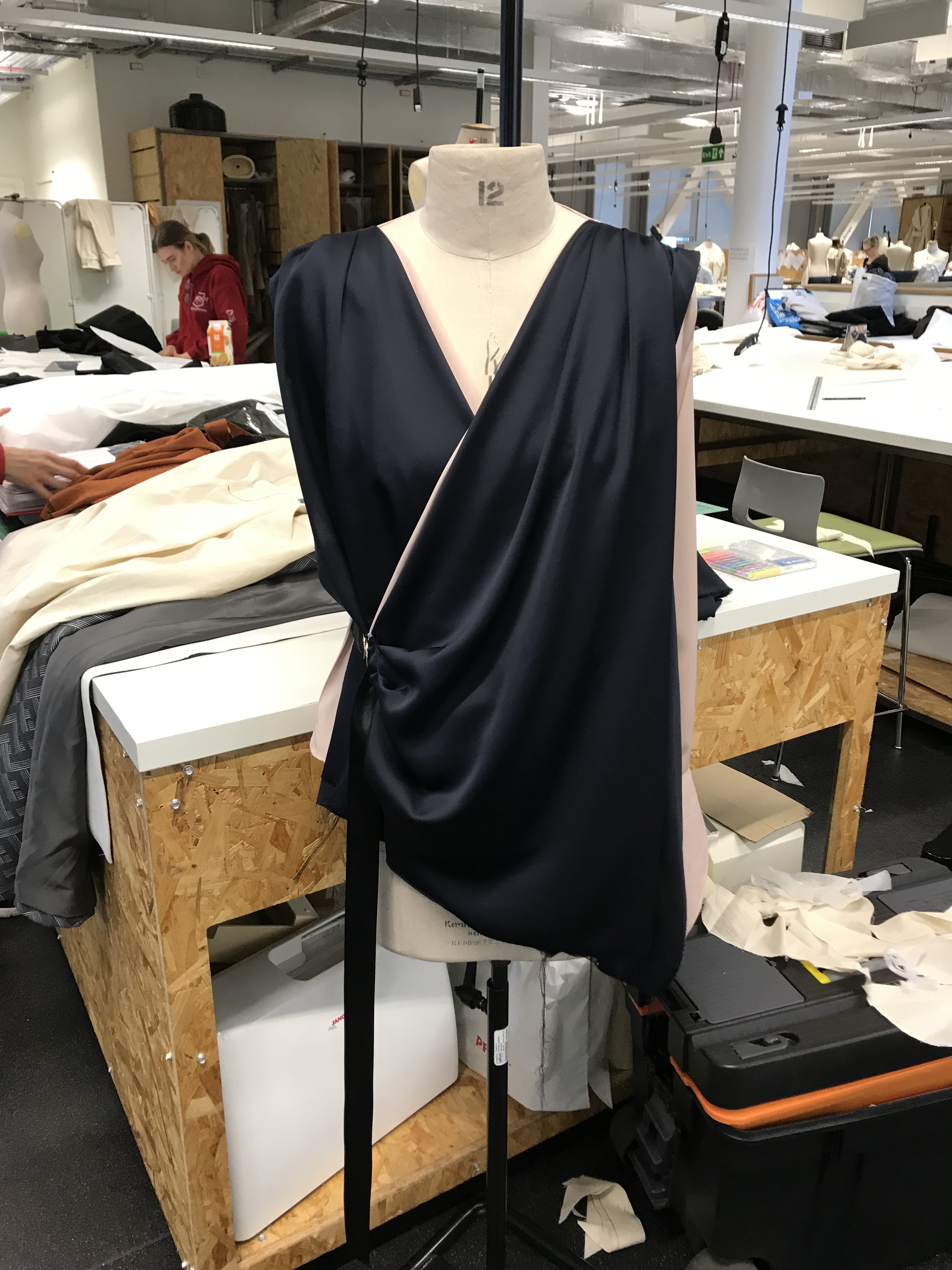 Today, Helen has her toile critic with Bashir and she is struggling to figure out the drape of the top for her third look. For my task I helped Helen in creating a silhouette for a top by draping some fabric on a mannequin which I was happy about because during the critic the teachers liked it and in a short amount of time we handled the stress well and worked together.