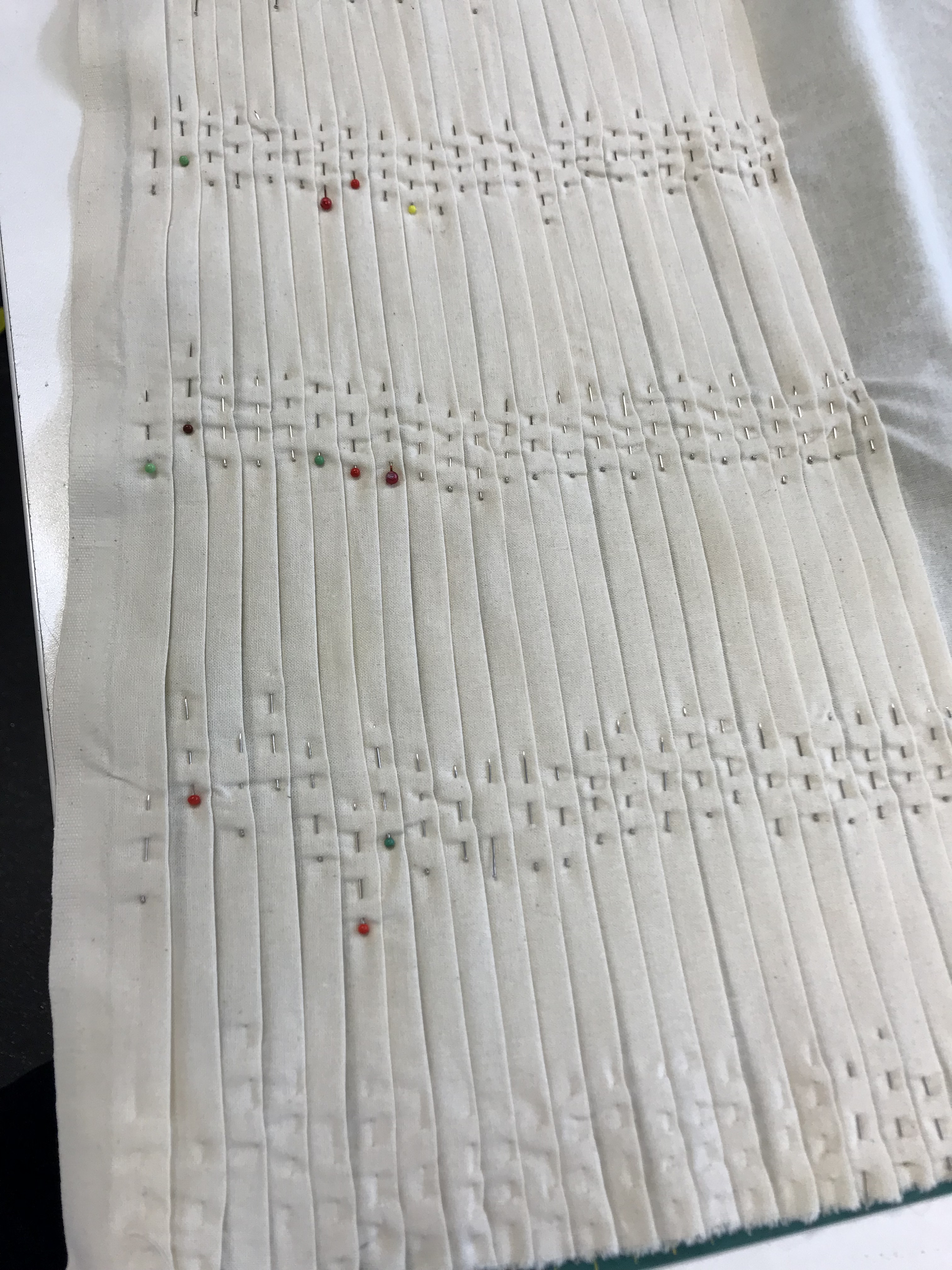 I cut a pattern for Helen, and she asked me to do some sample of different kinds of pleats. (knife pleats, box pleats, and reverse box pleats) This task does take so long as it need to be neat and straight to actually see which pleats is better to use for her skirt.